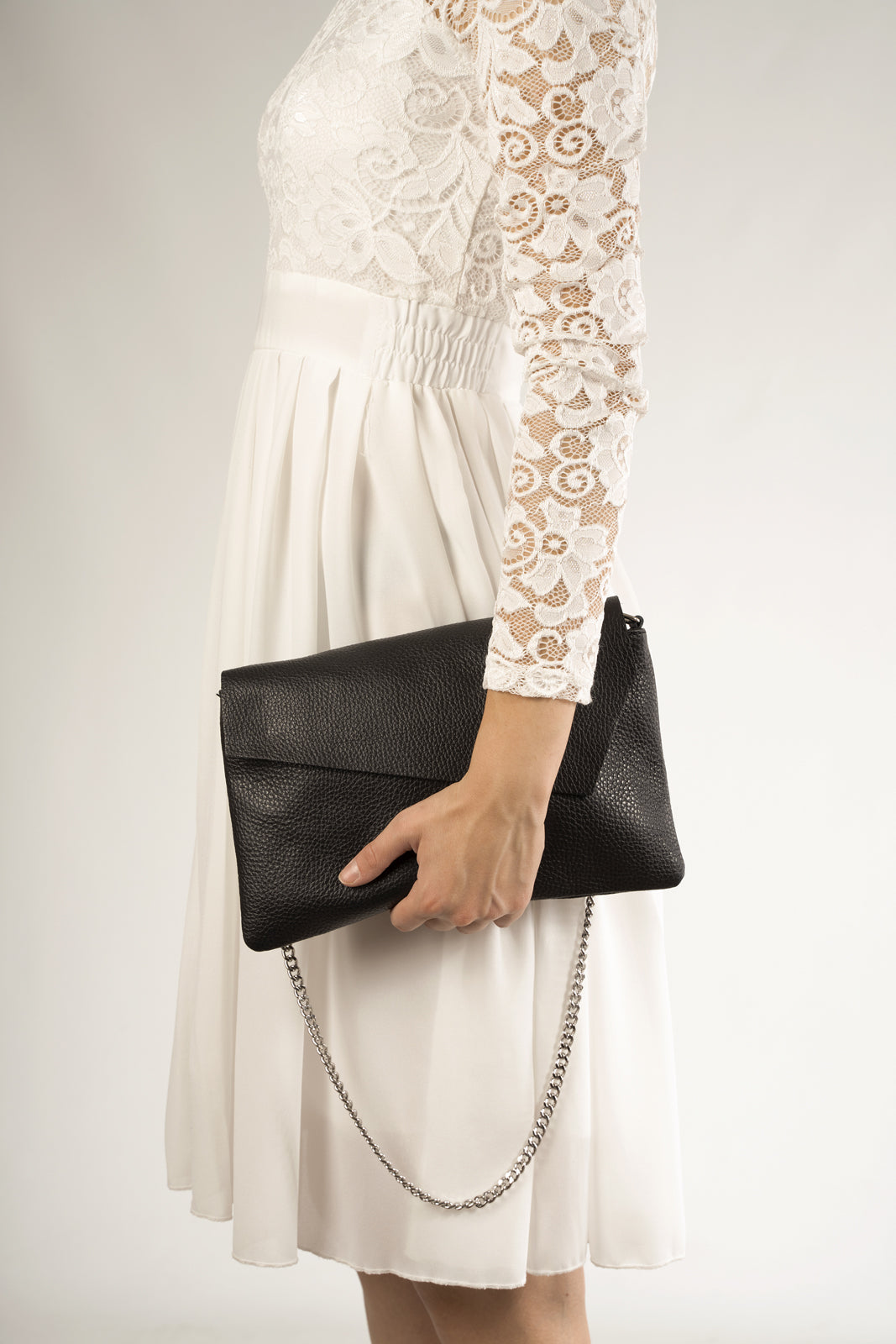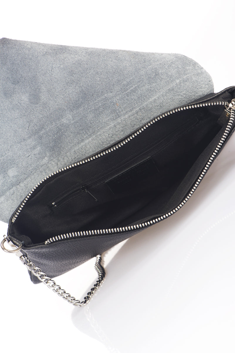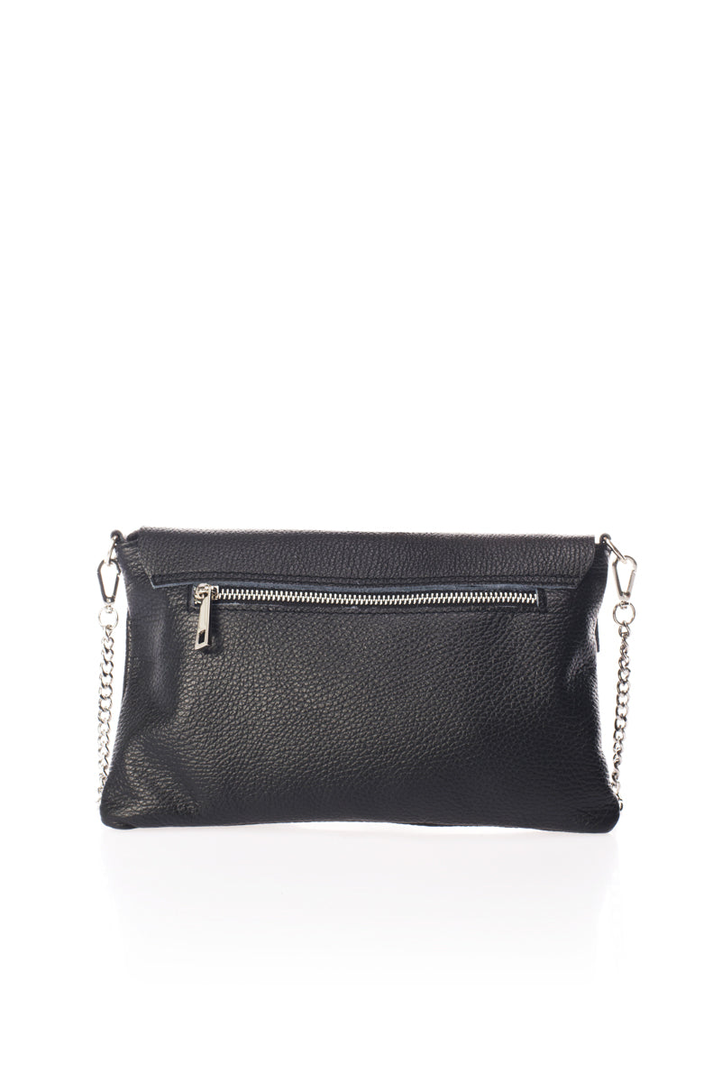 Borsa a tracolla da donna, realizzata in pelle Dollaro naturale, colore nero, dotata di una tracolla a catena da 110 cm, chiusura superiore con cerniera, chiusura a patta, tasca posteriore con cerniera e tasca interna con cerniera. Questa borsa è amata da qualsiasi donna che desideri un articolo sofisticato, compatto e sempre alla moda. Bisogna essere sanguigne per indossarla.