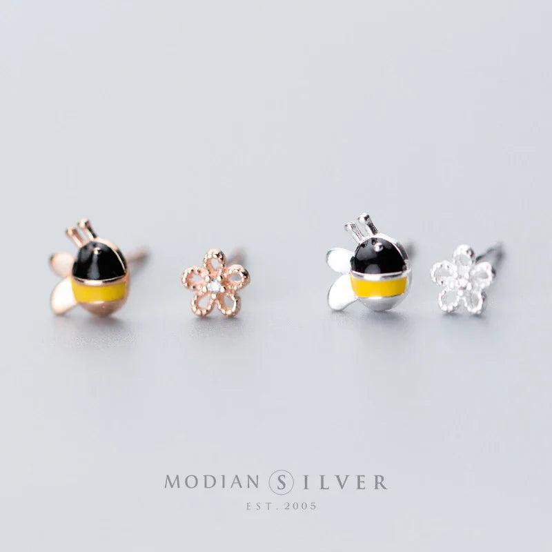 Orecchini a bottone in argento sterling 925 a forma di insetto e fiore smaltato per donna