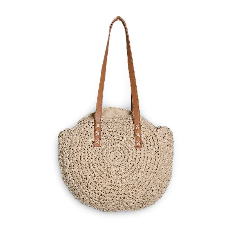 Borsa da spiaggia estiva rotonda in paglia lavorata all'uncinetto