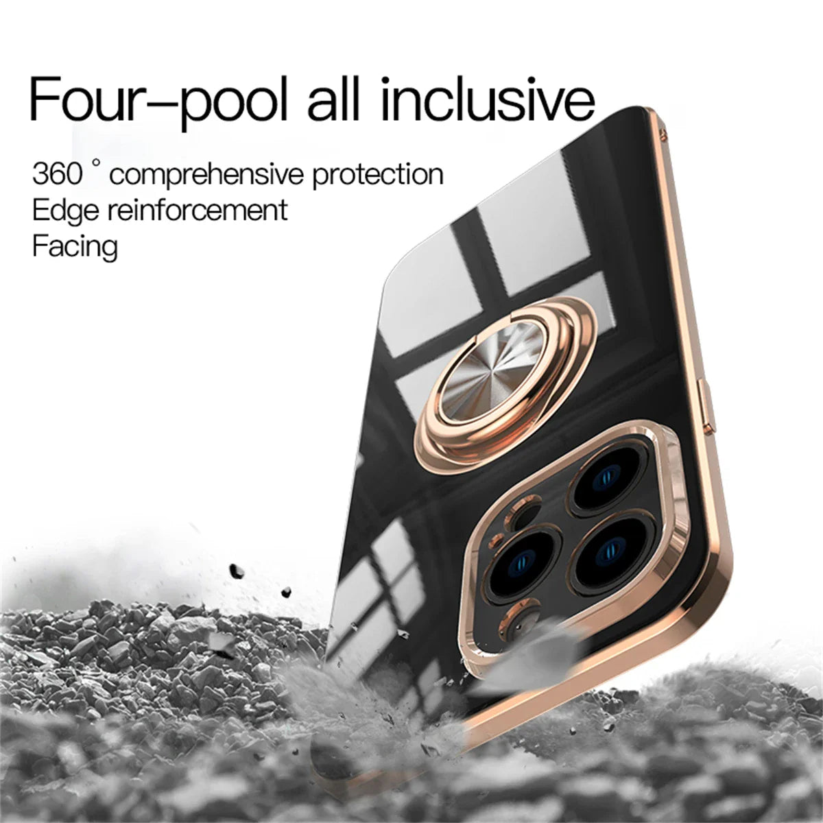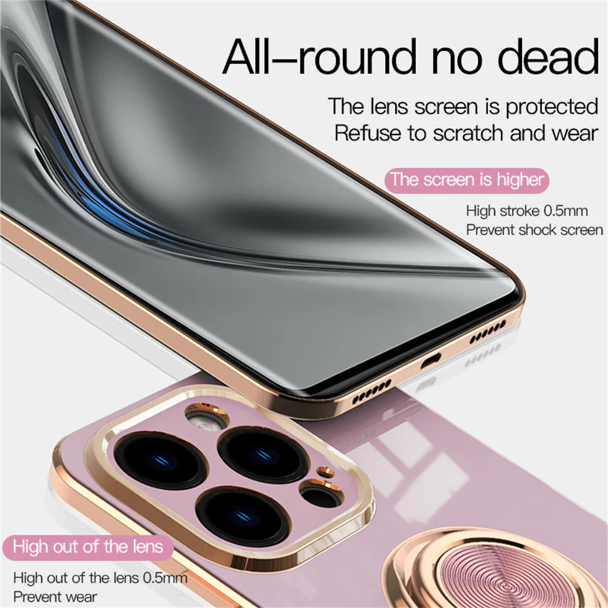 Luxury Plating Silicone Case For iPhone 15 14 13 12 11 Pro Xs Max Mini SE X XR 7 8 Plus Metal Ring Holder Stand Soft Phone Cover